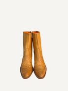 A Frye ankle boot in a rich, warm yellow that brings a little sunshine to your everyday. Subtle overlay details and simple embroidery add a crafted, lived in feel, while the western heel gives just the right lift without losing comfort. Finished with a side zip for an easy on and off, the silhouette stays sleek, classic, and endlessly wearable.