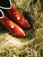 These Western Star Boots in Red are handcrafted in Spain. Our boots are made of the finest leather, and over time will adjust and mould to fit your feet perfectly. The boots have been treated with an extra darker polish for a vintage look. The Our boots compliment any style, whether you’re a 70s vintage babe, a Bohemian soul, a Western cowgirl, or just looking to spice up your style! These boots are a statement, investment piece that will elevate any outfit.